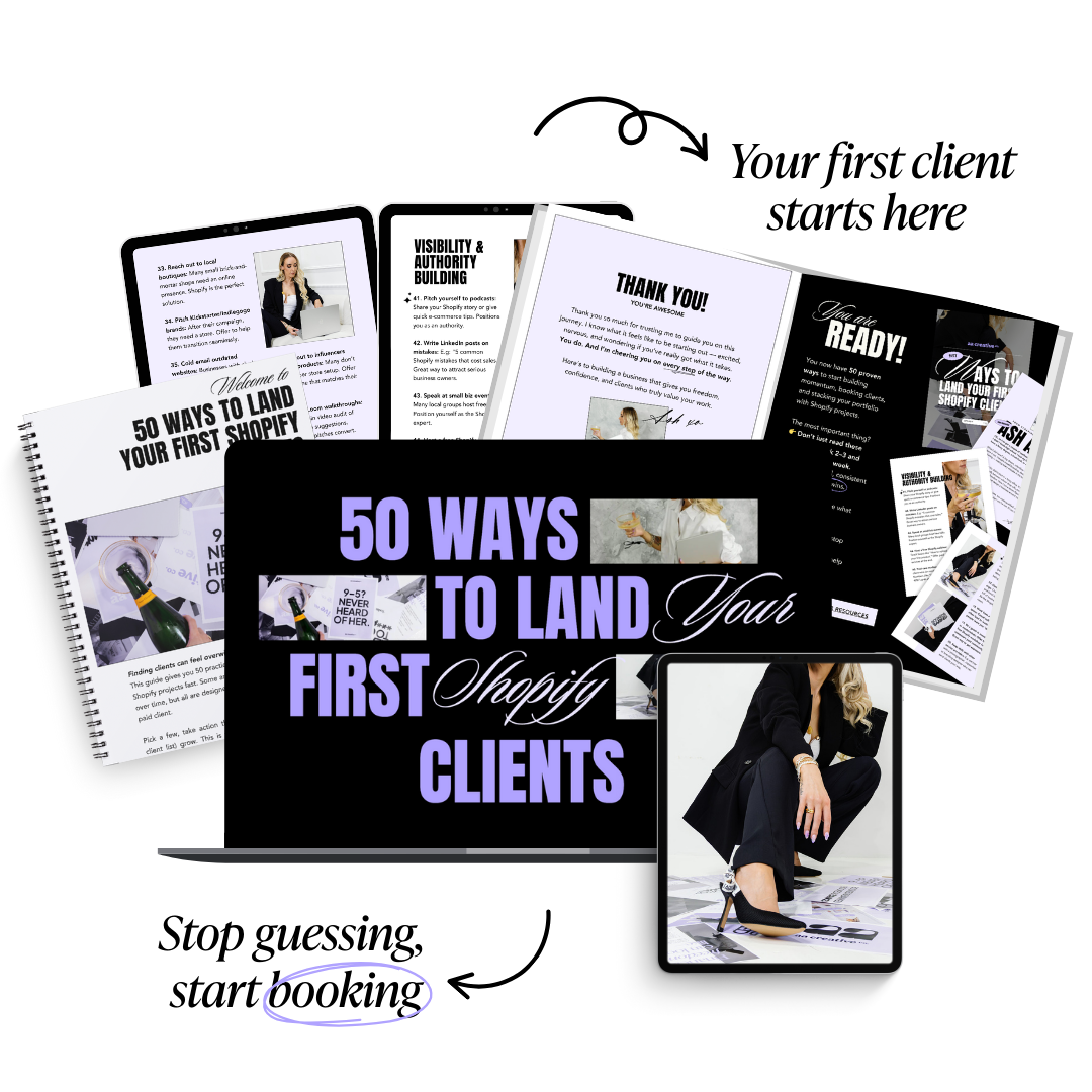 50 Ways to Land Your First Shopify Clients is a practical, straight-to-the-point PDF packed with real client-booking ideas you can start using immediately.